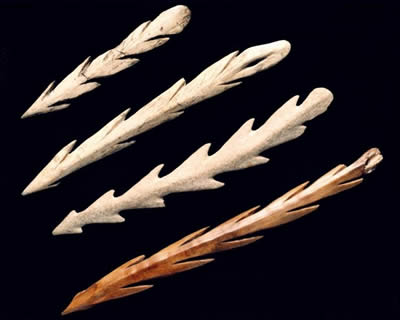 They are long rods of antler or bone with ‘barbs’ (points projecting backwards from the main point) down one or both sides.