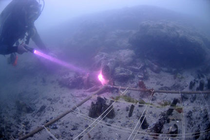 On the left is a picture of the trident in the ground, on the right is a reconstruction Detail © Oxford Archaeology North