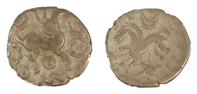 A typical Iron Age coin, showing an ear of corn on one side and a horse on the other.