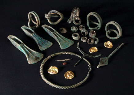 Metal objects were usually cast in moulds. They include tools (especially axes), weapons and ornaments. Bronze axes look very different to the stone axes produced in the Mesolithic and Neolithic and were much sharper than stone.