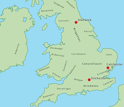 Examples of oppida include Camulodunum (Colchester) in Essex, Silchester in Hampshire and Stanwick in Yorkshire. They often formed the ‘capitals’ of tribal territories: late Iron Age Britain was divided between a number of different tribes including the Brigantes at Stanwick, the Atrebates at Silchester and the Catuvellauni at Colchester.