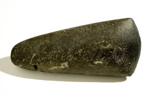 After using hammer stones to knap a nodule and produce a rough shape, the axes were ground or polished to produce a sharp edge and the smooth shape shown here.